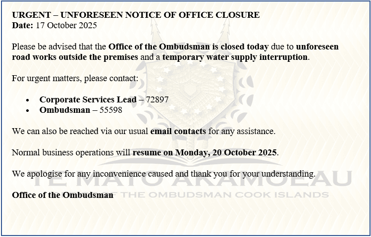 Please be advised that the Office of the Ombudsman is closed today due to unforeseen road works outside the premises and a temporary water supply interruption.